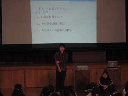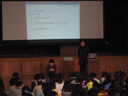 夢についての話だけではなく,なぜその夢を持ったのか,夢の実現のためにどうしていきたいのかなど,小学校生活の中で影響を受けたことについても話していたので,全校生にその思いが伝わる発表になりました。
