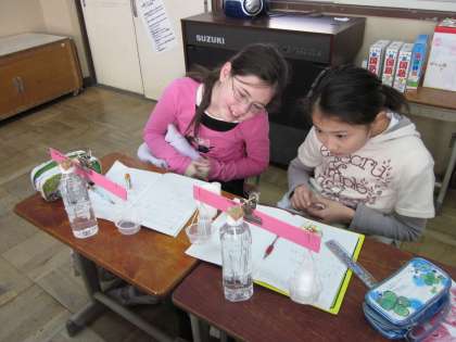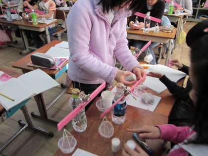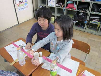 理科の学習で,身近な材料を使って天秤を作りました。できた天秤を使ってものの重さを比べました。同じ体積のガラス球と金属玉球の重さを比べ,物の種類が違えば,同体積でも重さが違うということに気付き,同体積の砂,塩,小麦粉の重さを比べて,その考え方が正しいことを調べました。