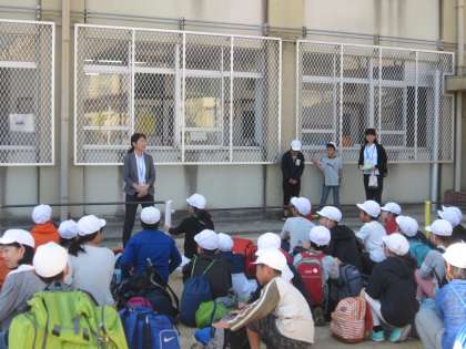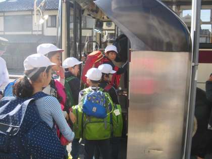 素晴らしい晴天にも恵まれて,本日から4日間,5年生が花背山の家長期宿泊学習を行います。午前8時40分に出発式を行い,午前9時過ぎ学校を出発しました。