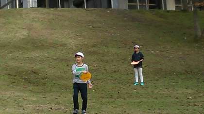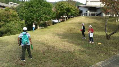 フライングディスクゴルフです。スタート地点から,何回でゴールのかごに入れられるかというゲームです。全部で9ポイントあります。どのグループもルールを守って協力してできました。素晴らしい!!