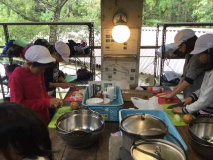 材料を切って準備しています。ご飯を炊く準備もしています。どの班も手際よく動いています。