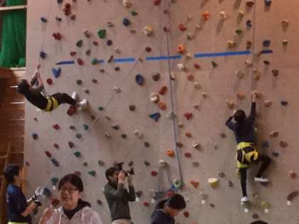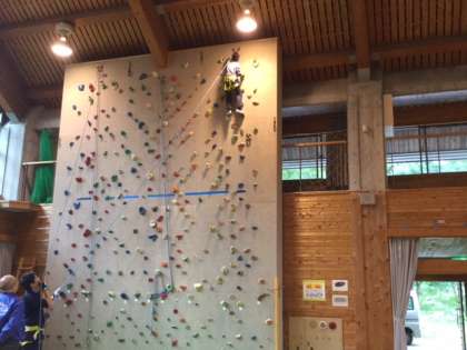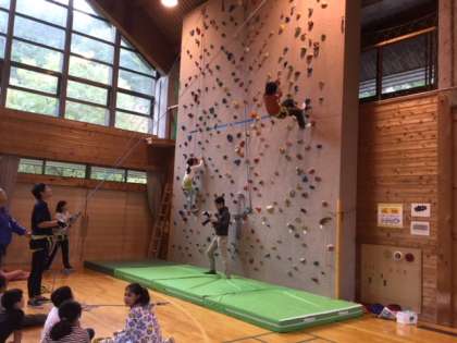 クライミングは,命綱をつけて登ります。担任の先生が綱を引っ張っています。ボルダリングより,うんと高く上まで行くと地上から7メートルだそうです。降り方も決まっています。これぞ挑戦です。みんな勇気を出して頑張りました!