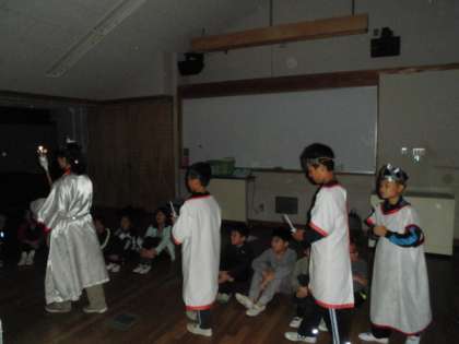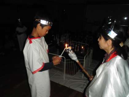 厳かな雰囲気の中、最初に火の女神が3人の火の子に火を授けます。