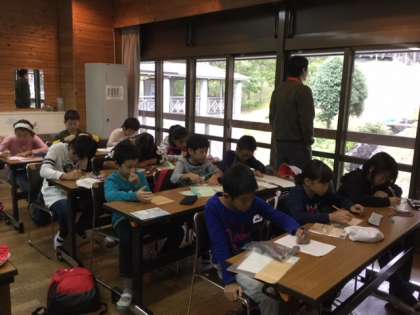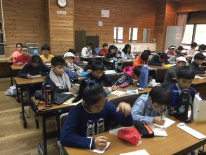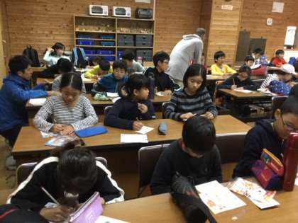 家族への手紙を書いています。この4日間の思い出や頑張ったことなどを知らせたり,お家の人への感謝の気持ちを込めたりしています。あと数時間で,お家の人に会えます。渡すのが楽しみですね。お家の方も楽しみに待っていてください。