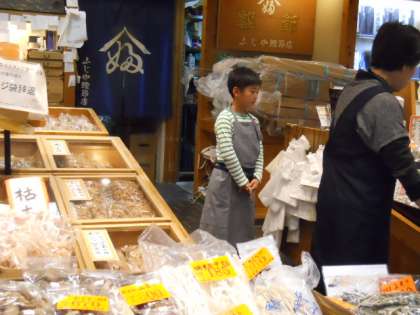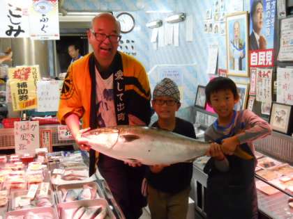 魚屋さんでは、大きなブリを持たせてもらいました。それぞれのお店でいろいろと工夫していただき、ありがとうございます。時間がたつにつれて慣れてきた子どもたち。本当によい体験をさせていただきました。