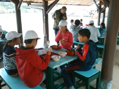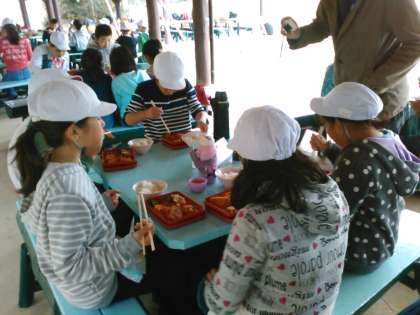 昼食からあづまやで食べています。かなり風が強いです。ご飯のおかわりもいっぱいして,元気モリモリです。