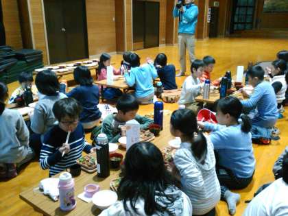 夕食です。外は風が強いので,プレイホールで食べました。皆,元気にしています。食欲もありますが,疲れてきています。