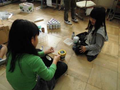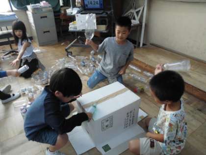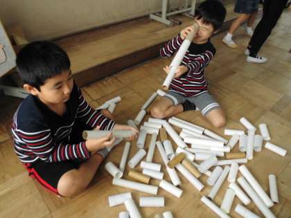 生活科の学習で,集めた廃材を使って,いろいろな遊びを考えています。