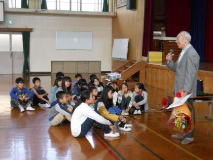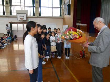 今日の朝会では、20年間、四錦の子どもたちの安全を見守り続けてこられた地域の方が、この度、見守る隊をお辞めになることになったので、感謝の集いを行いました。