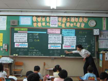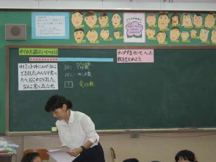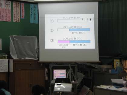 ある子どもは,ノートに,数量の関係を正しいテープ図に表し,30−20=10としていました。また,次の問題「あさがおのたねが65こありました。1年生にあげたので,のこりが3こになりました。なんこあげたのでしょう。」でも,同様に,テープ図はできているのに,65−62=3としていました。それぞれに食べた数,あげた数を暗算で求めて式に表しているのです。立式に課題はありますが,この子どもの論理は正しいのです。時間の経過に伴って数量の関係を立式していたのです。「時間の経過に捉われずに,全体と部分に着目させる視点で捉えさせる手立てが必要だった」と私たちは反省としてもちました。指導者の山田先生,第2学年2組の子どもたちに感謝します。ありがとう。