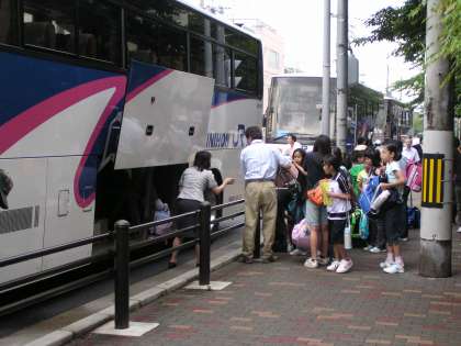 みさきの家へは,バスに乗っていきます。バス乗車中に必要なものや,みさきの家についてすぐに必要となるものを車内に持ちこみ,それ以外の大きな荷物はトランクルームに入れます。これも自分で分かって仕分けし,やっていくことです。協力も必要となります。たくさんの保護者の方々や教職員に見送られて出発しました。
