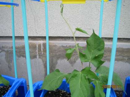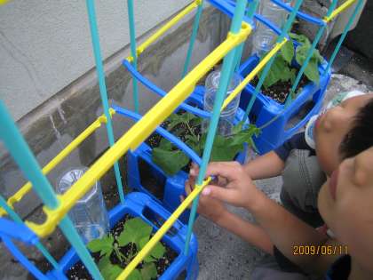 梅雨に入りました。一年生のあさがおは順調に大きくなってきています。今日の観察でつるが伸びてきていることを発見しました!「ペットボトルにまきつこうとしてる〜」「これからは,まきつくものがいるね」ということになり,支柱をたてました。つるがまだ伸びていない子どもたちは「はやく のびてきてね・・・」とあさがおに語りかけていました・・・。
