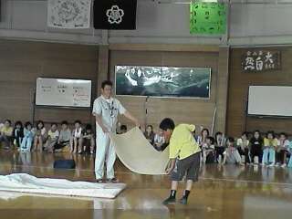「オリエンテーション」です。所内での生活の仕方につての説明を受けました。シーツは,掛けと敷きとが引っ付いて袋状になっていて,袋状の中に入って寝ます。シーツは,二人組みで敷いたり,たたんだりします。二人ですると,ほこりも立たず,きれいに早く,仲良くできます。