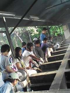 野外炊事は,かまどの火起こし,米の給水,食材を切って,なべに入れるなど,分担して作ります。