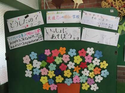 「しきんの木」とは,玄関にある児童が考えた仲良くなるためのめあてを掲示した木のことです。なかまを大切にする子に育ってほしいと思います。