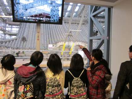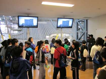 姫路城大天守修理見学施設「天空の白鷺」では,8階の高さまでエレベーターで上がり,天守閣の大屋根の修理を間近に見学しました。「下から見ていたら分からなかったけど,鯱ってあんなに大きかったんや」とびっくりしたり,修理のために作られた素屋根工事の様子や修理の様子のVTRを見たりするなど,工事の期間しかできない貴重な体験をすることができました。
