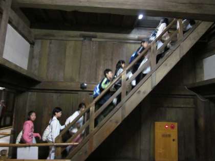 「天空の白鷺」の次は,修理中の大天守の中に入りました。工事のため,3層までしか行けませんでしたが,急な階段やせまい通路など,天守閣の中がどのようになっているのか知ることができました。