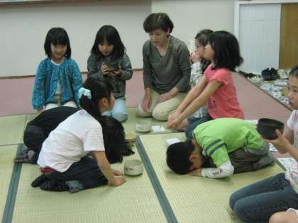 おじぎのしかた,真(最もていねいなおじぎ)・行(中間のおじぎ)・草(えしゃく程度のおじぎ)を教わったり,お茶の点て方を教わったり,お菓子のいただき方を教わったりと,たくさんのことを初日で教わりました。
