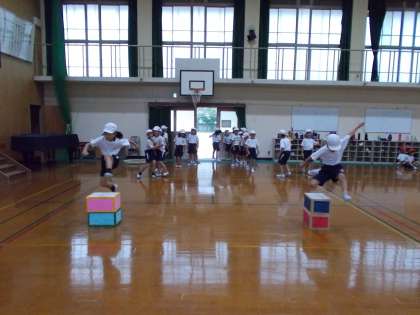体育の授業で,「とびくらべ」という学習をしています。5歩とびくらべ,5歩しまとび,ゴムとびくらべ,箱とびの4種類です。子どもたちはより遠くへ飛ぶたに,一歩下がってから跳ぶ,助走をつける,踏み込む時に足に力を入れるなどの工夫をしながら頑張っています。