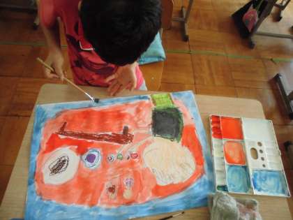 夏休みの思い出。家族といっぱい一緒に過ごすことが出来た夏。一緒に話しながらお手伝いをした思い出を作品に表しました。絵の具を使って家の中の色,家の外の色,あれこれ色を作りながら表現しました。