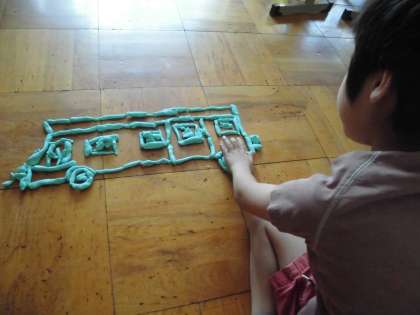 粘土板の上で始まった粘土。粘土板には収まりきらずどんどん机にはみ出していき・・・最終的には床を広く使ってのびのびと表現する姿が見られました。