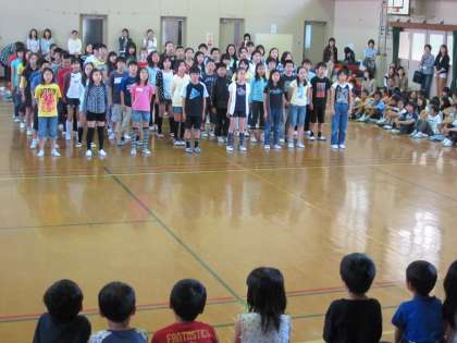 6年生の子どもたちは,1年生に届けたい思いを色にたとえ,その色を思い浮かべながら「つばさをください」を歌いました。歌声が体育館に響くとともに,55色の優しい色が体育館いっぱいに広がり,1年生をはじめ会場全体を包み込みました。