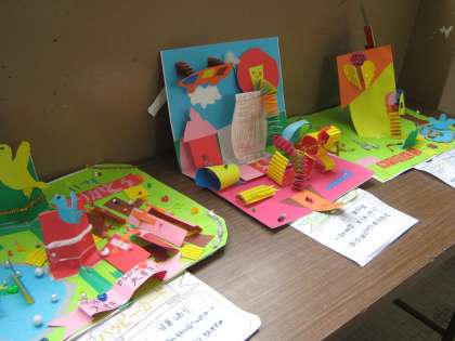 開くと飛び出す仕掛けを入れた,とても楽しい作品です。子どもたちは、贈る相手の喜ぶ顔を思い浮かべながら,「お兄ちゃんは,野球が好きやから」とか「お母さんはお花が好きなの」とつぶやきながら工夫をこらしてつくっていました。