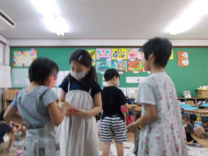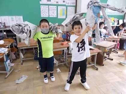 2年生の図工の交流で、「しんぶんしとなかよし」の造形遊びをしました。新聞紙で、へびやドレス、プールや動物など様々なものを作りました。