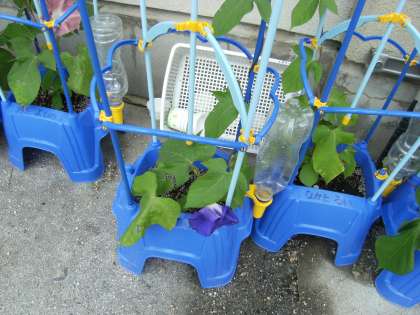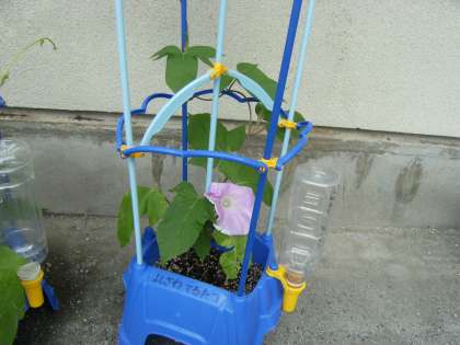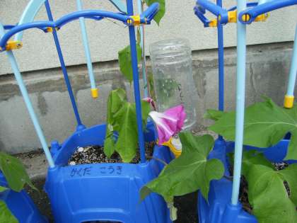 1年生が大切に育てている朝顔から待望の花が咲きました。薄紫・青・濃い紫と鉢によっていろいろです。