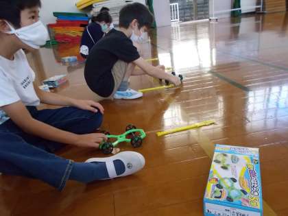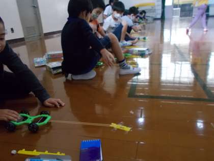 理科の学習で,風とゴムの力を学習しました。学習の最後に模型の車を体育館で端から端までゴムや風の力で動かしていました。