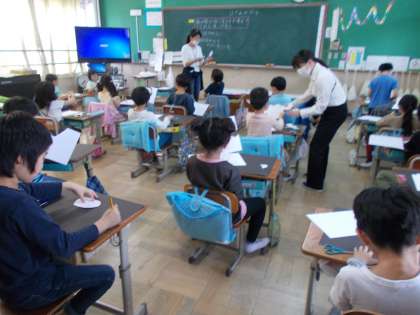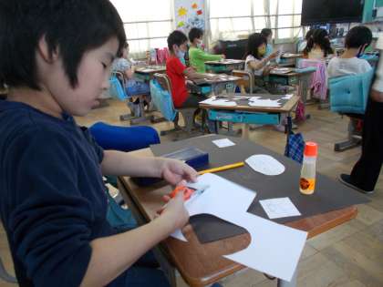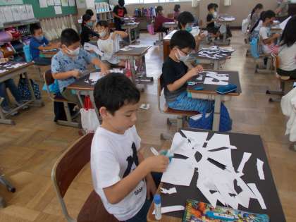 図工の授業では、「はさみのあーと」をしました。いろいろな大きさの白い画用紙から、好きな形を切り出していました。みんなの思い描く自由な世界を楽しそうに切って、黒い画用紙に貼っていました。子どもたち同士で、見合ったり、お話ししたりなどとても楽しそうでした。