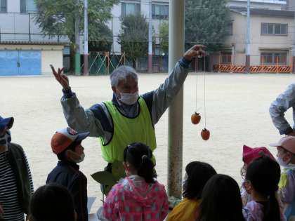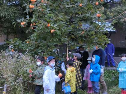 本校のビオトープは,東は大文字山や吉田山,西に鴨川や御所の中間に位置し,自然の生物がここを中継地としてやってこれるように,学校内に山里を再現しています。その中には,柿,りんご,キウイなどの果樹がたくさん実をつけ,子どもたちは自分の手で収穫することができました。渋柿は家で干し柿をつくる方法を教えていただきました。また,池に住むザリガニも木の枝を竿にしてたくさんつっていました。