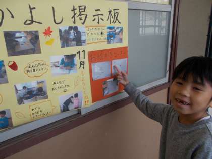 新たに、お絵かきコーナーを設けて、子どもが書いた作品を載せることにしました。書いた本人も指をさしながら、とても嬉しそうにしていました。