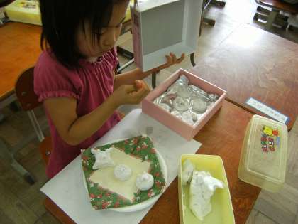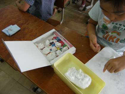 図工の「クッキーやさんになろう」の学習で,粘土を使っておいしいクッキーを作りました。それぞれの思いのこもったクッキーを,お家から持ってきた箱や紙皿に飾りをつけて並べ,実際に売り場に並ぶように盛り付けました。出来上がった作品を交互に見て,「おいしそう」「食べたい」という声も上がっていました。