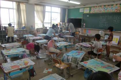 2組は「みさきの家」に向けてみんなで頑張ろうということで,エアコンをつけていませんでした。窓を開けて風は通していますが,快適とはいきません。(みさきの暑さに比べたらまだまだましです)汗を拭きながら,それぞれの作業に集中している姿にたくましさを感じました。この集中力! 暑さになんか負けてません!