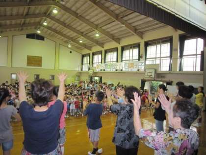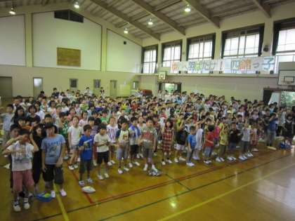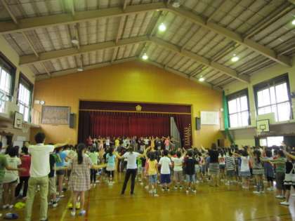 始業前の時間を使って,夏祭りの時に披露する手話コーラスの全校練習をしました。いつも指導してくださっている民生児童委員協議会の皆さんと指導を受けてきた実行委員の子どもたちが体育館のステージに立ち,お手本を示します。『見上げてごらん夜の星を』と『ビリーブ』の2曲分ですから,私にはかなり難しそうに思えるのですが,子どもたちの吸収力はやはりたいしたもんです。どんどん自分のものにしていきます。