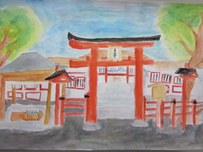 子どもたちにとっては,今までにあまり経験がない彩色方法でしたが,朱色の鳥居の向こうに広がる境内や木々の様子を,水加減を工夫して,淡く美しく表現していきました。描き始めから完成まで,かなり時間がかかりましたが,子どもたちは,最後まで集中して描きました。
