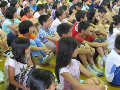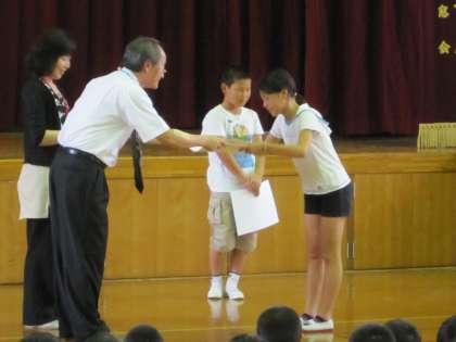 7月22日、1時間目に夏休み前の朝会がありました。朝会では、1.校長先生のお話 2.6年生児童の歯の表彰 3.委員会活動から 4.3−1,5−1から国語の発表と盛りだくさんの中身でした。校長先生のお話では、二つの約束についての話がありました。一つは、8月29日に病気やけががなくみんなが集まれること。もう一つは、夏休みの37日間、何かやりぬきませんかという話でした。「37日間出されたものを残さず食べる」なんていうことでもいいよと言われると、子どもたちもうなずきながら、自分のめあてを考えているようでした。6年生の歯の表彰では、6年間虫歯がなく、歯並びや歯のよごれなども問題のなかった12名の名前が吉川養護教諭から呼ばれました。代表の二人が校長先生から賞状を手渡されました。