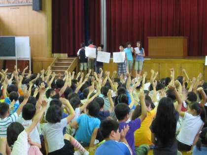 委員会からの発表では、給食委員会と健康委員会から子どもたちのクイズやお知らせがありました。クイズに答える子どもたちは、答えを聞くたびに歓声を上げて喜んでいました。健康委員会の子どもたちは、張りのある声でマイクなしでしっかりと伝えることができていました。続いて、国語の発表では、まず3年1組の代表の6人がはっぴょうしました。社会科で学習した学校の周りの様子を、言葉で詳しく話していました。大変緊張していましたが立派に頑張りを見せていました。
