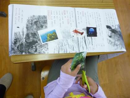 日本語教室では,国語の教材文に出てくる言葉について解説を聞いたり,写真で実物を確かめたりしながら,内容がよりよく理解できるようにしています。(2年「スイミー」に登場する生き物を確かめているところです。)