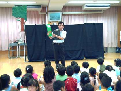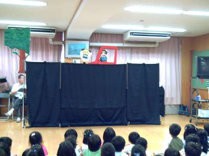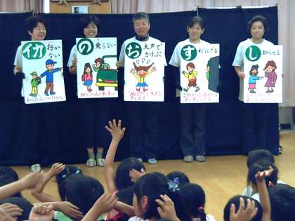 7月7日川端・平安レディースの方に防犯教室を開いていただきました。桃太郎の登場人物を使って人形劇仕立てで「知らない人には絶対についていかない」ことを,子どもたちにわかりやすく教えていただきました。子どもたちは「いか・の・お・す・し」でしっかり覚えることができたようです。また,「こども110番の家」について,何かあったらかけこんでいいということを知らせていただき,学校からお家までの道筋でどこに「こども110番の家」があるのか日頃から確かめておくことが大切だと思いました。