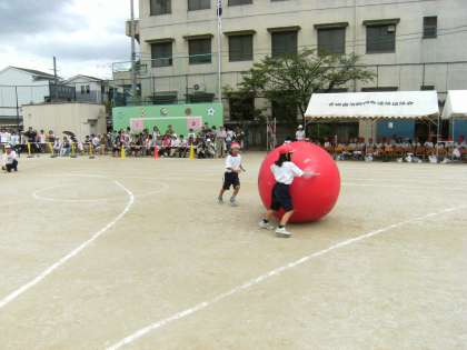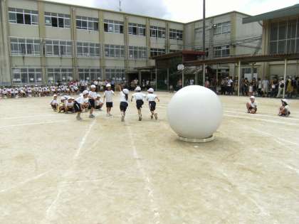 1年生にとっては初めての運動会でした。上級生の演技や競技を見て「かっこいい」「すごい」と感激の声をあげていました。1年生の団体競技は「大玉ころがし」でした。練習のときは,お互いに勝ったり負けたりでした。今日は,どちらも最後まで気を引き締めて頑張りました。白組が2回勝ちましたが,整列の時の姿勢も良かったです。