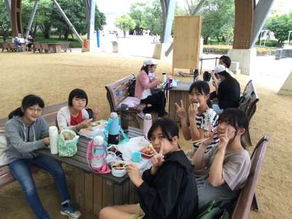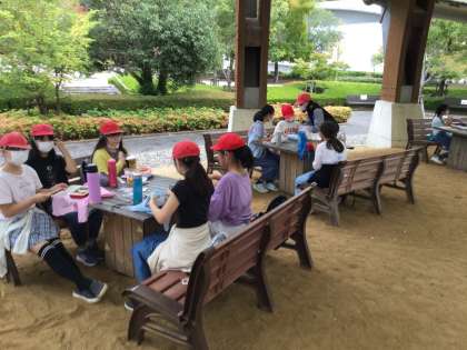 ランチタイムです。お家で作ってもらったお弁当をおいしくいただきました。この後は、グループ活動です。園内の散策と子ども科学館の見学です