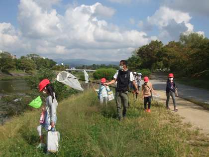 企業の講師を招いて,鴨川に虫探しに出掛けました。バッタとキリギリスの違いや,羽根の音の出し方,食べ物など詳しくお話頂きました。また,自分たちと同じ命であることも話して頂き,元の場所に返すこと,飼うなら最後まで飼うことなど,生き物を捕まえたときのルールについても知ることができました。