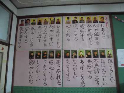 そんな言葉をロールプレイも交えて使ってみることから理解を深めています。そして,それぞれの言葉にあてはまる表情を子ども達に考えてもらって写真撮影し,ポスターを作っています。日々の出来事の中で「今はこの言葉があてはまりそうやなあ」など結び付けていくことで子ども達に様々な言葉が定着していけたらと取り組んでいます。