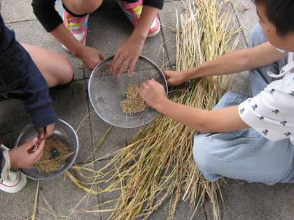 先週、ビオトープの一角で育てていた稲を刈り、今週は脱穀をしました。金ざるの目を使用してたくさんの稲を脱穀しました。1組2組合同で、協力して活動できました。