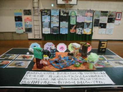 飲み終わったペットボトル,食べた後のお菓子の箱,クリスマス飾りで余ったモールやわた,使い終わった段ボール・・・捨てられてしまいそうになっていたものを組み合わせて新しい”いのち”を吹き込みました。みんなの作品がどこにあるのか探してみてもらえたらと思います。また,どんな材料を組み合わせて作っているのかを考えるのも面白いかもしれませんね。