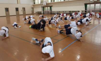 26日(火)の体育科で体幹トレーニングをしました。8種類の体幹トレーニングをした後に腕立て伏せをみんなでしました。