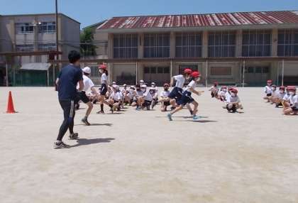 授業の後半では1組対2組でリレー対決をしました。どの子も真剣に走っていて,応援も大盛り上がり!