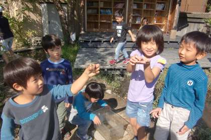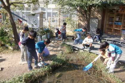 ビオトープの池には,やっぱり生き物好きがたくさん集まっていました。狙っているのはザリガニです。生まれてまだ日がたたない若いザリガニを見つけては歓声を上げています。
